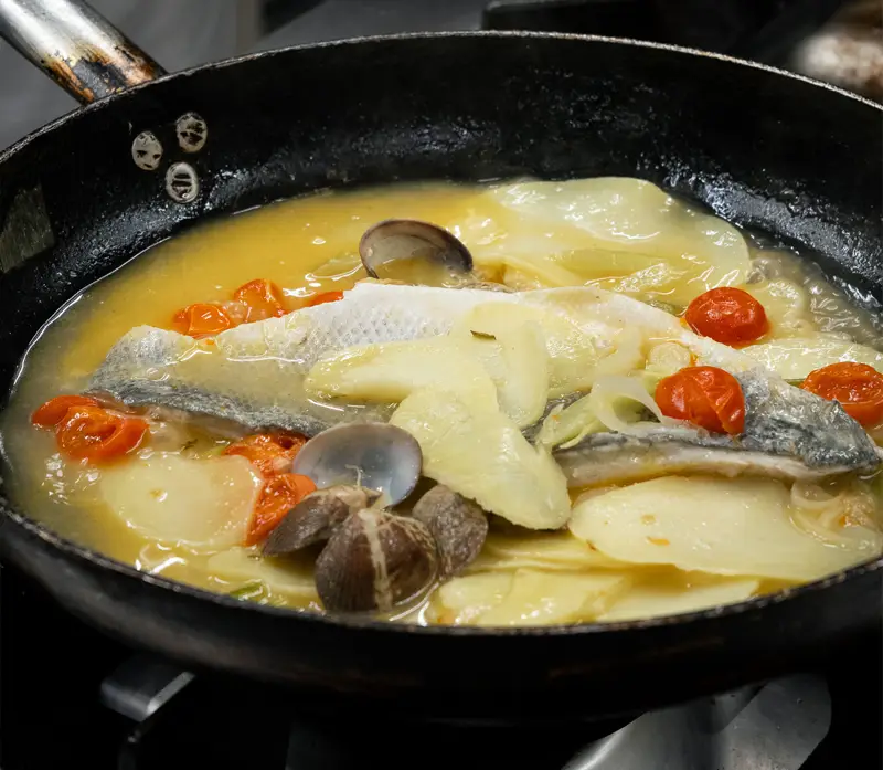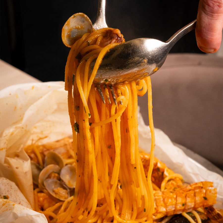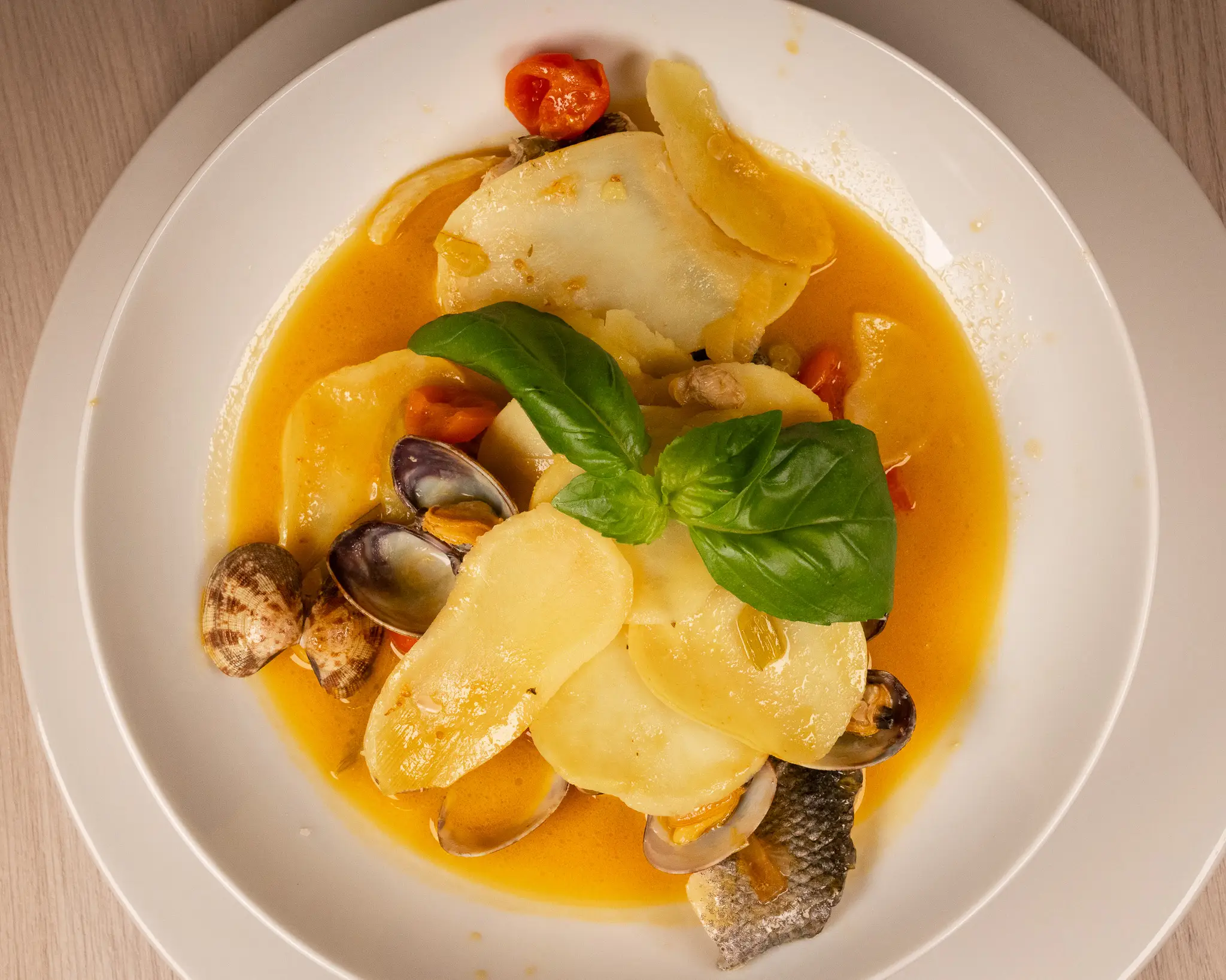 Una cucina guidata dalla passione e dalla ricerca, che ci porta a creare ricette, capaci di deliziare occhi e gusto. Gli antipastini crudi e caldi, le paste fresche di nostra produzione (per gli intolleranti, su richiesta anche pasta senza glutine), i pesci e i crostacei più ricercati preparati secondo le nostre migliori ricette, le nostre proposte a base di carne nazionale selezionata e i dolci rigorosamente fatti in casa, sono l’impronta delle nostre mani.
